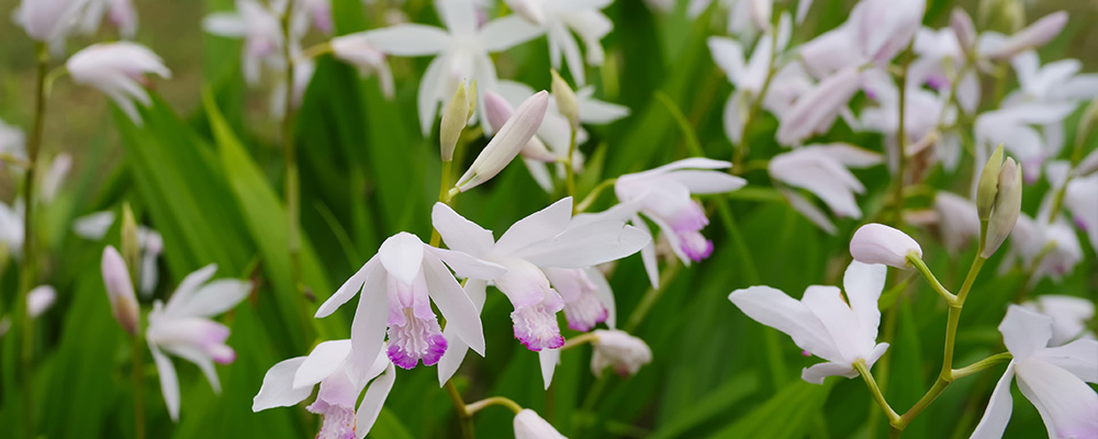 - Bletilla: Also known as the Chinese Summer Ground Orchid, Bletilla are a personal favorite around these parts. They come up in the spring with a spike of miniature Cymbidium-like Orchids (also known as Corsage Orchids). They have beautiful pleated leaves, and while they fare well in full sun, they make for a tremendous shade-tolerant plant.