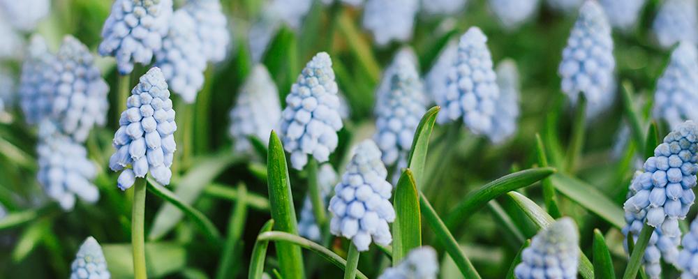 Muscari give great texture to the mid-spring garden with their short flower spikes loaded with berry-like flowers. Baby’s Breath is the softest blue you can imagine with a lovely grape-like fragrance. Up to 4” tall, winter-hardy to zones 4-9.