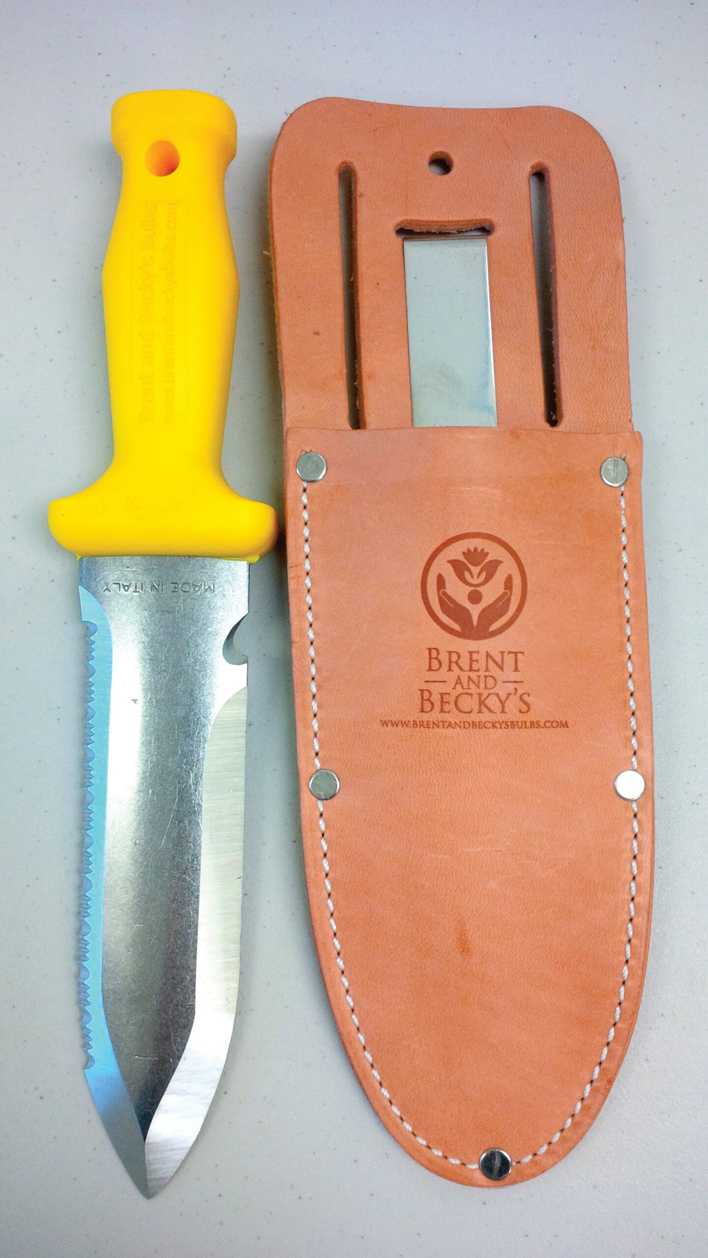 This has become Brent's new favorite garden tool. He uses it to cut the roots of weeds, uses the 'stab/pull/drop' method for planting small bulbs and for planting small perennial plugs; stainless steel blade; leather sheath with the Brent and Becky's Bulbs logo and website address! Tool is 11 long; blade is 6 1/2" x 1 3/4"; weight is 8 1/2 oz.