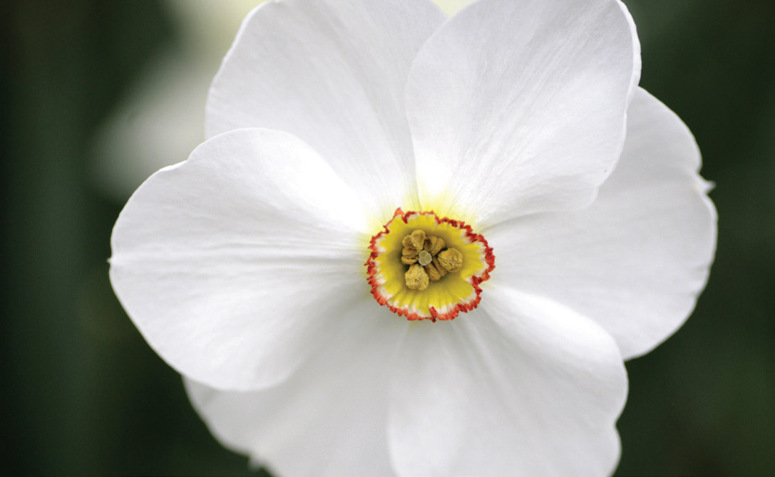 Division 9 - Poeticus"Usually one flower to a stem; perianth segments pure white; corona or cup usually disc-shaped, with a green or yellow center and red rim; flowers fragrant." Excellent perennials with a spicy fragrance, dogwood-like blooms; good for picking; best in whz 3–7; 5 per sq. ft.