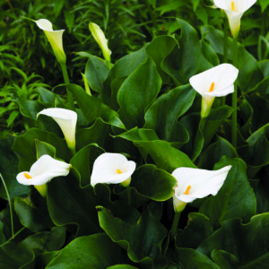 Well known as a graceful cut flower especially in elegant, large flower arrangements, what may not be known about this plant is its adaptability. We have grown them successfully in a flower border along with other bulbs and perennials, but the aethiopica types also grow happily at water’s edge or even potted up and submerged - pot and all - in the shallow end of our pond. The spotted leafed cultivars prefer a drier site and often perform well as container subjects that can be kept dry and from freezing when dormant; native to South Africa, its graceful, vase-like flowers bloom from mid through late summer; critter resistant; 1-3 per sq. ft.; 12”-18” and whz 7-10 as long as the drainage is good; 16/18cm bulbs, unless otherwise noted.