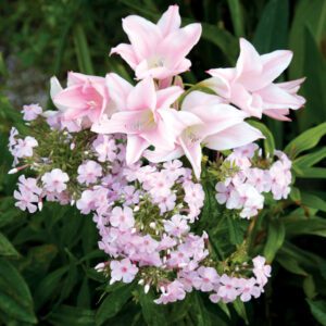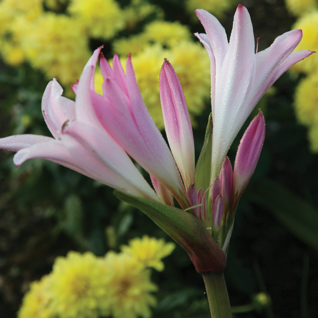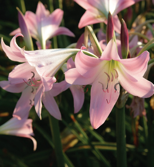 This deer and rodent-proof plant is a cross between Amaryllis belladonna and Crinum moorei that adores our hot, humid summers! Bold, dark green foliage is evergreen in zones 8-10 and deciduous in zone 7. Soft pink flowers bloom in clusters of 10-16 atop 2’-2 ½’ stems. It’s one of our favorite garden plants and is wonderfully fragrant! For us it seems to be more perennially reliable in full sun in rich, well-drained soil. 20/24cm bulbs; 1 per sq. ft; whz 7-10; blooms late summer - until frost; plant in containers in whz colder than 7; heirloom 1920.