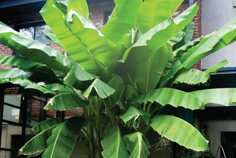 aka hardy banana that is grown for its 2′ wide by 6′ long tropical leaves; fast growing; creamy yellow flowers followed by inedible green fruit if there is a long enough growing season; 8′-14′; whz 4-11; full sun.