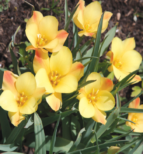 Little, yellow tulip with bronzy feathering; wavy, gray leaves; fragrant, mid spring bloomer; 4″-6″; 6/+ cm.