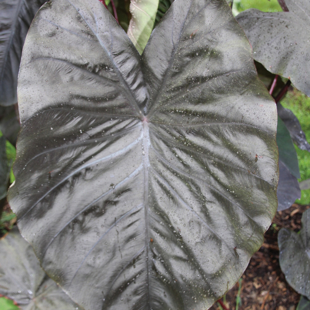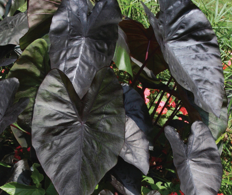 PP23896, Deep black, glossy foliage with electric blue veins; from the Royal Hawaiian® Series; full sun to part shade; 4′-5′; whz 7b-10. This item is a PLANT, and will arrive in ~4″ pots from tissue culture.