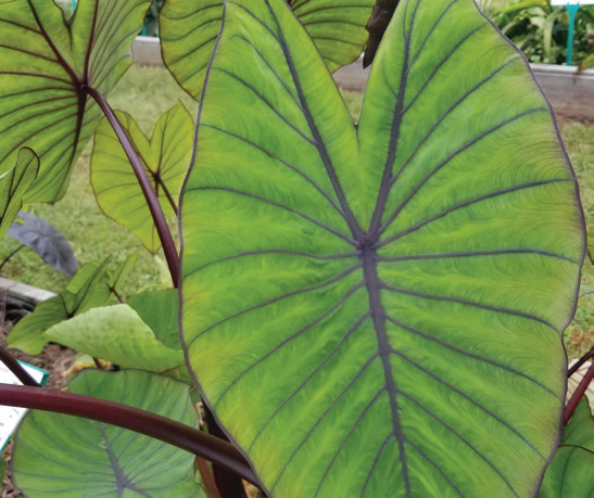 PP20003, medium green leaves with bluish-purple veining and dark stems; from the Royal Hawaiian® Series; 3′-4′; full to part sun; whz 7b-10. This item is a PLANT, and will arrive in ~4″ pots from tissue culture.