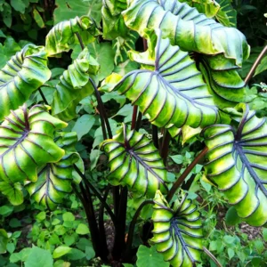 Colocasia ‘Pharaoh’s Mask’ is a striking elephant ear with bold green leaves highlighted by raised black midribs and veins for a dramatic, sculpted look. Perfect for adding instant tropical flair and bold texture to the garden or poolside. Flowers are hidden by the foliage. Deer and rabbit resistant; 4′ tall; full to part sun; whz 7-10. This item is a PLANT, and will arrive in ~4″ pots from tissue culture.