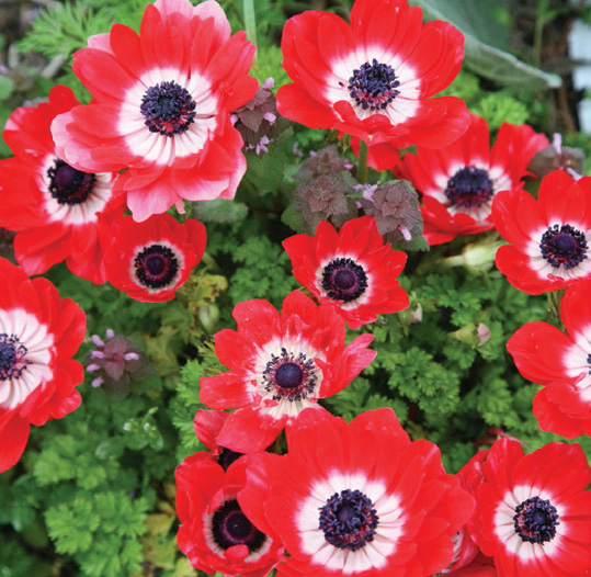 Very showy, 'daisy-like' flowers with single or double rows of petals and ferny foliage; hardy to whz 7–10 and can be planted in the fall; whz 03–6 should plant in the spring; great cut flower; soak before planting and plant shallow on edge; early-late spring; Heirloom; 8"–10"; 5-10 per sq. ft.