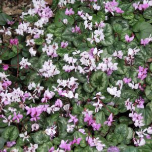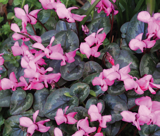 Once established, blooms late winter to early spring; roundish, variegated leaves last until summer; variable pink to white flowers; 13/15 cm