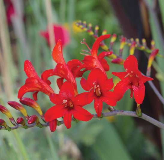 Up to 50 tubular, starry, warm, colorful blooms decorate gracefully-arching stems, adding festive brightness to the mid to late summer garden when lots of other plants have finished their show. These pest resistant wonders, with swordlike foliage, blend in nicely and add linear accents to the perennial border. The flower arranger’s dream, long-lasting Crocosmia adds a special effect in arrangements. Happiest in full sun, Crocosmias sometimes wait until the second season to bloom; 5-10 per sq. ft.