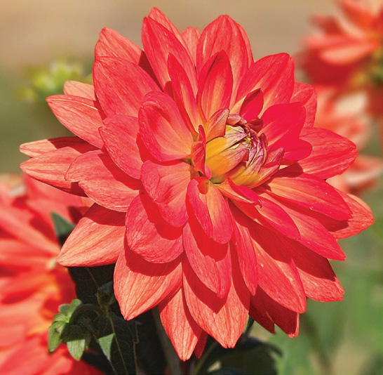 Strong stems support decorative type salmon-orange flowers with bright yellow centers; 2’-3’.