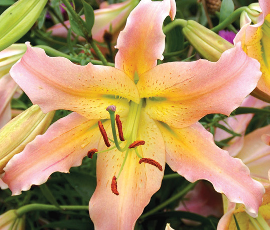 Lilium Oriental/TrumpetLarge 5"-7" flowers held up by strong stems; bloom mid-late summer; lovely, soft sweet fragrance.