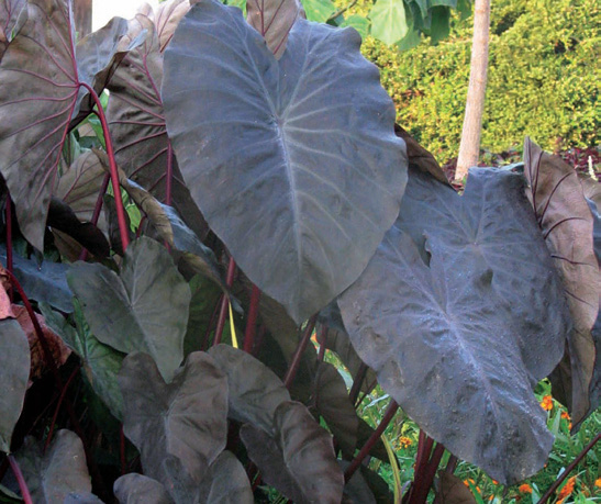 Native to tropical Asia and Polynesia and considered an evergreen perennial tuberous herb, Colocasia has given us lots of pleasure all summer long with its huge, velvet or glossy textured, dark green, heart-shaped leaves that are lined with darker veins, adding real drama to the shade garden near our pond. It’s also a sturdy backdrop for perennials in the flower border, although we suspect in most full sun situations, it will perform better if a soaker hose provides a little constant moisture. Excellent for water gardens when planted in a pot submerged in the pond; plant 18” on center; whz 8-11 (zone 7 in damp soil with mulch). (Hint: The height seems to have everything to do with the richness of the soil and the available moisture); we have indicated by each item whether they will arrive in bulb form or from tissue culture in ~4” pots ready for your garden or for a larger pot on the heat mat, depending on where you live.