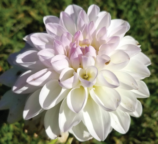 A ball type; although the flower’s buds are pink, it matures to an antique white with tips of each petal brushed with a pale pinkish lavender; 2′-3′.
