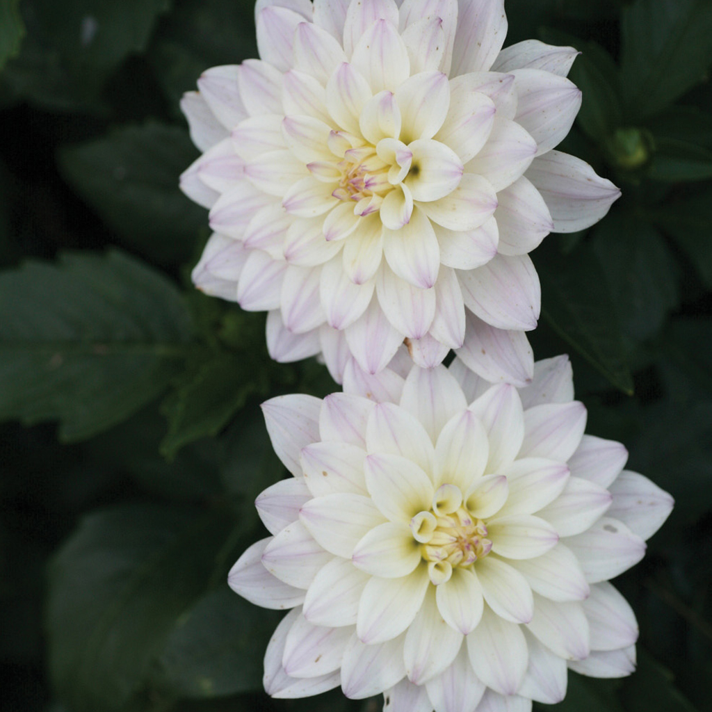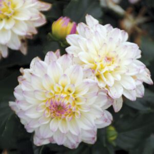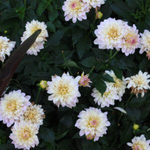 Creamy Dahlia brushed with dusky rose, a bit of yellow deep in the heart with a hint of cabernet when in bud; 1’-2’.