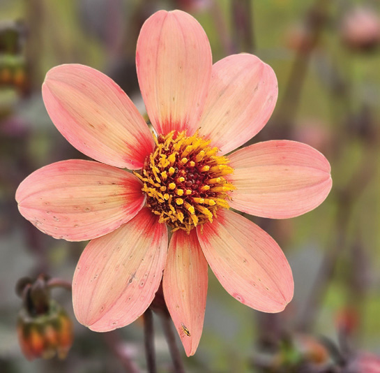 Single-flowered type; apricot pink flowers with red ring shown off by dark foliage; 2′-3′.