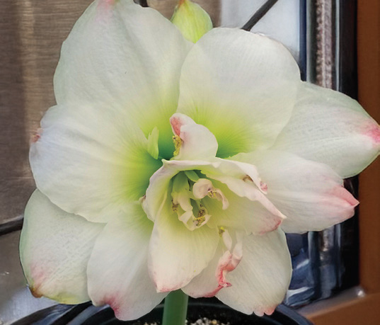 Fully double, ivory white with pink brush strokes on the tips of the petals; 18″-24″; ~8 weeks to bloom.
