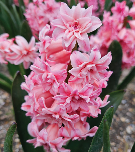 Double, rose-pink florets that soften in color as they mature; 8″-10″; mid spring.