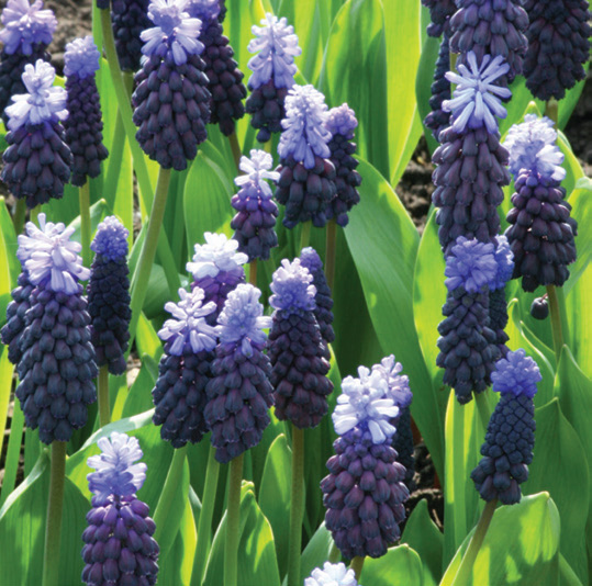 Spikes covered with grape-like, long-lasting blooms in a range of blues and whites; great as an edging or 'shoes and socks' plant, for forcing or for designing a 'river'; fragrance reminiscent of grapes; naturalizes; armeniacum-types send up foliage in the fall which makes it a great 'garden marker' to help locate other, more difficult to find, spring flowering bulbs that need to be fertilized in the fall; critter resistant; Heirloom; 9/10 cm bulbs unless otherwise noted; whz 4-9.