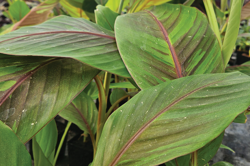 A new introduction hardy to zone 5! Huge green leaves with purple streaks; grows well in containers and in the garden; 10′-13′; whz 5-10; full sun. This item is a PLANT, and will arrive in ~4″ pots from tissue culture.