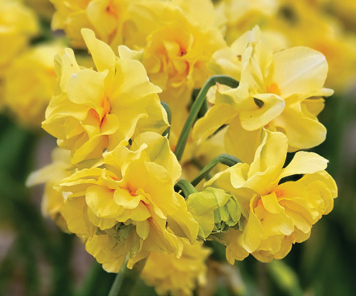 Mulitple, fragrant flowers per stem; pale yellow petals, sometimes with a hint of green, intermingled with orange; 12″-16″; mid spring; 12/14 cm; Classic pre-1950.