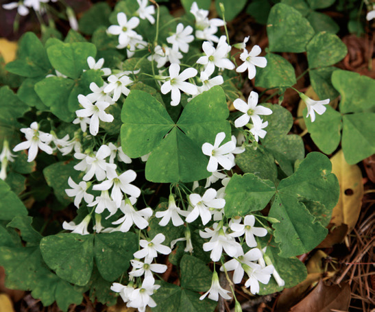 Clover look-alike with green tops and burgundy bottoms on triangular-shaped leaves and white, often tinged pink, flowers; whz 7-10.