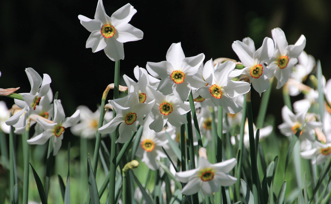 Division 9 - Poeticus"Usually one flower to a stem; perianth segments pure white; corona or cup usually disc-shaped, with a green or yellow center and red rim; flowers fragrant." Excellent perennials with a spicy fragrance, dogwood-like blooms; good for picking; best in whz 3–7; 5 per sq. ft.
