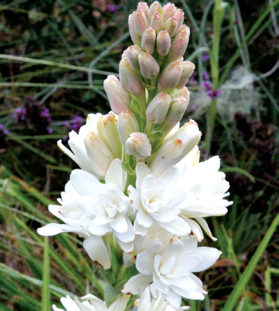 Lots of tubular, super fragrant blossoms with incredibly thick, waxy substance bloom on top of 18”-24” stems with foliage that is 1’ tall. If the bulbs are planted in the spring, they bloom in late summer. However, when they overwinter, they bloom earlier and seem to last forever. Bulbs can be started indoors for early bloom, and should be if you live in a climate with a short summer season (see our heat mat). Victorian favorite; used pre-1600; 3-5 per sq. ft.; whz 8-10; has overwintered in our garden with winter mulch and good drainage. (This was one of our grandmother's favorites - one flower makes the house smell wonderful!)