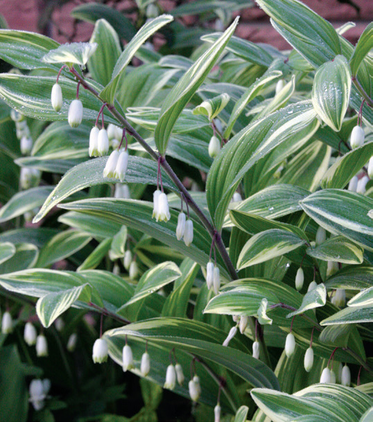 A shade-loving perennial prized for its elegant arching stems, clean variegated foliage, and dainty spring flowers. It is one of the most dependable, low-maintenance, graceful plants for woodland gardens. Small, white, pendant flowers hang from graceful, arching stems in late spring. The medium, waxy, green leaves are narrowly edged creamy white. Grows 18″-26″ tall in well-drained, humus-rich soil; deer and rabbit resistant; whz 3-8; bareroot.