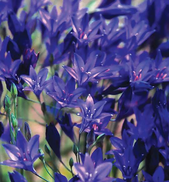(Brodiaea) American native with many umbels of upfacing, bell–shaped flowers on each strong stem; leaves often shrivel before the flowers appear; full sun to partial shade; needs excellent drainage in the summer; terrific cut flower; whz 5–9.