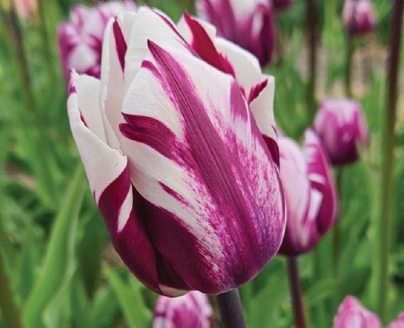 the Single Late Group.” Widest range of colors and heights; Note: Approximately 10% of all tulips produced are purchased for outdoor garden use. Since 90% of the market is being used for pot culture, naturally, that’s also where most of the hybridizing efforts and production dollars are being spent. ‘Triumph Tulips’ are used mainly for forcing and are the largest group of tulips available; very showy but generally not as perennial; whz 3-8; most bloom mid spring. Great combined with mid season daffodils, hyacinths, muscari, anemones, species tulips and Leucojum. 12/+ cm unless otherwise noted.