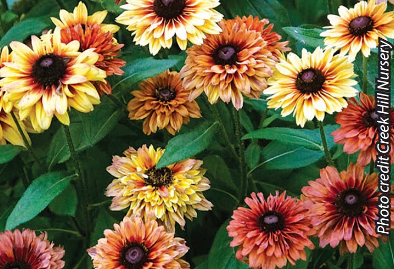 PP31789 – double flowers in muted shades of antique rose, caramel, and peach to pinks, oranges, and a range of yellows; full sun; a fun cut flower; 12″-14″, whz 5-9; plug.