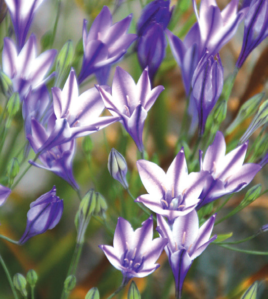 (Brodiaea) American native with many umbels of upfacing, bell–shaped flowers on each strong stem; leaves often shrivel before the flowers appear; full sun to partial shade; needs excellent drainage in the summer; terrific cut flower; whz 5–9.
