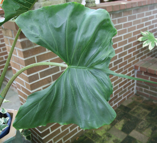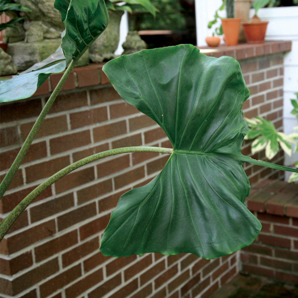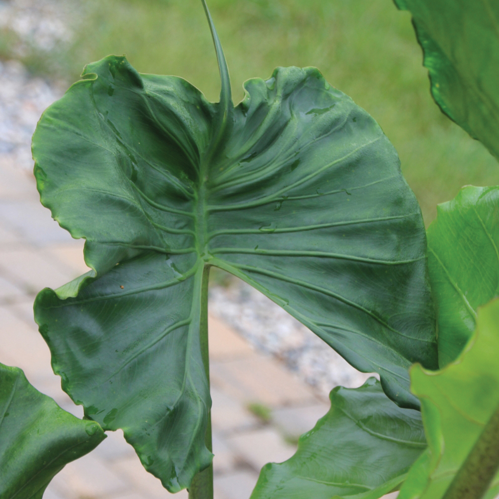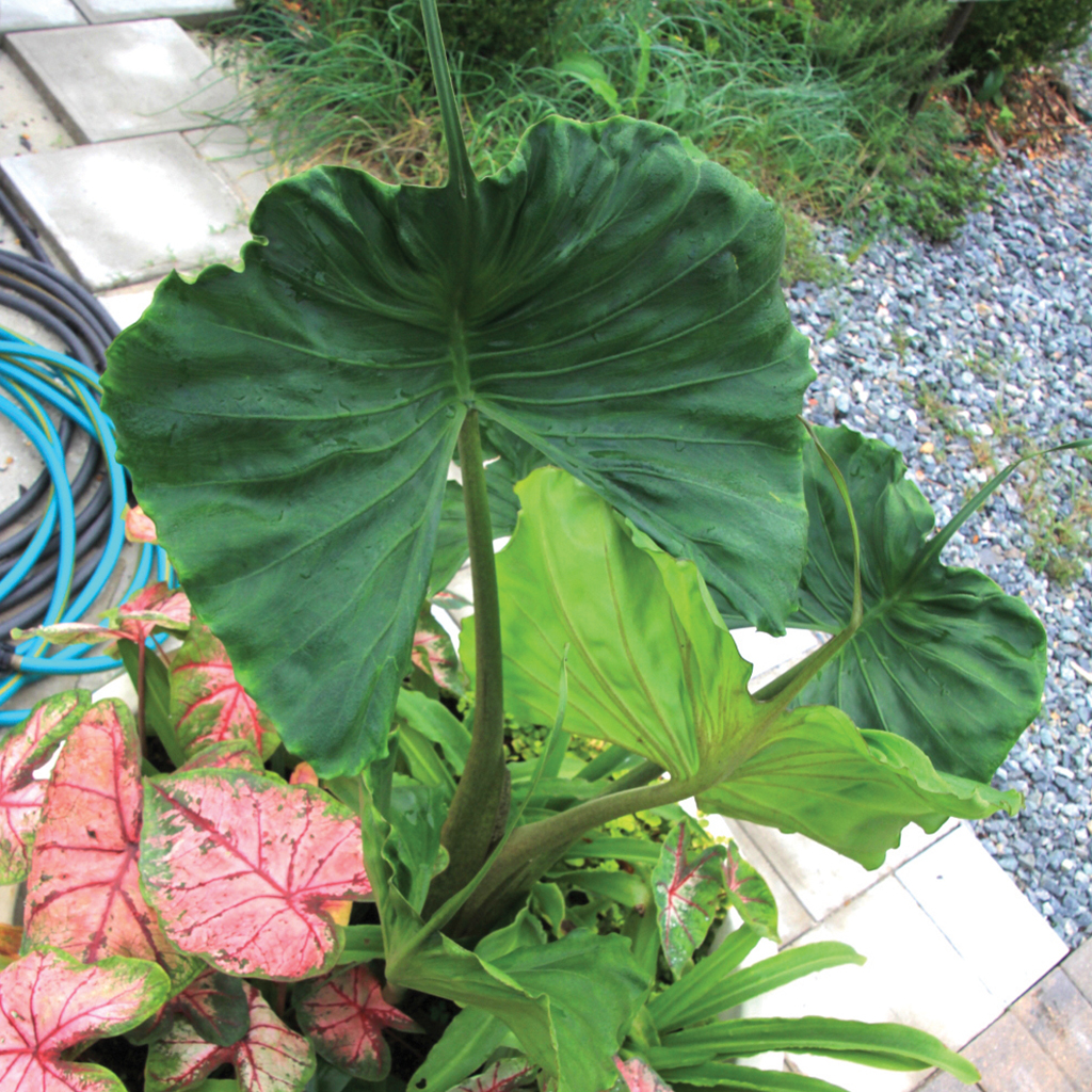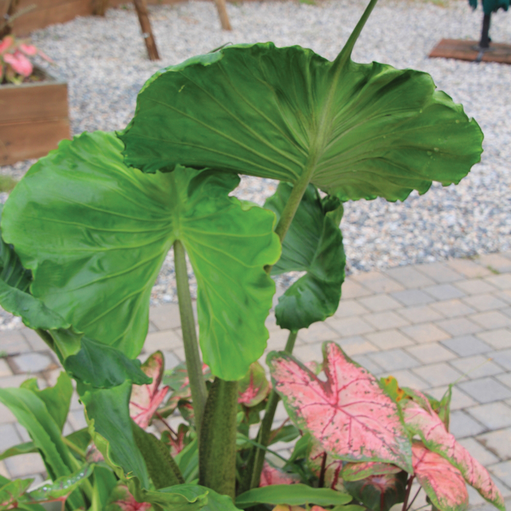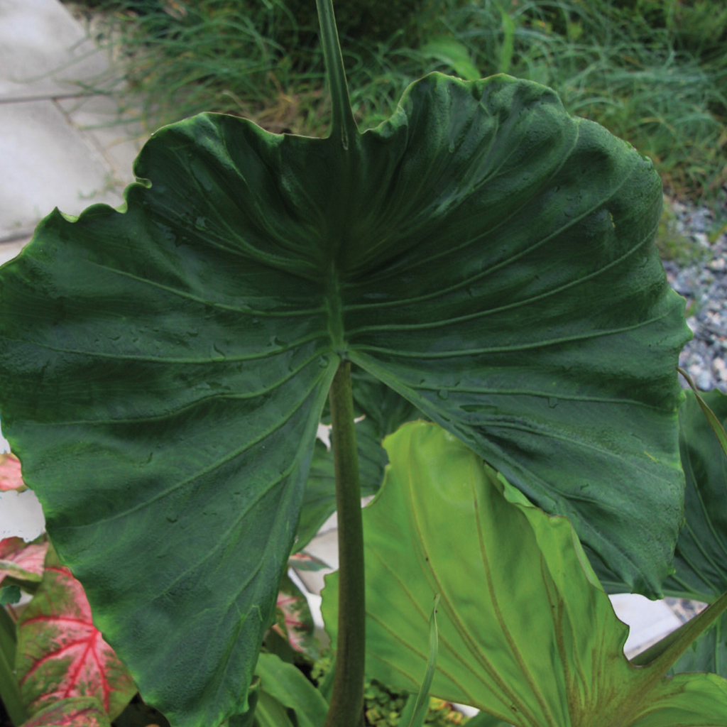 Huge, critter resistant elephant-ear-type leaves which normally point to the heavens, add lots of focal impact in the tropical garden and summer patio containers; native to tropical S. and S.E. Asia, these great plants sway and ‘sing’ a special song in the warm, mid-late summer breezes; performs best in compost rich soil with adequate moisture; will arrive in ~4” pots from tissue culture, indicated by †. (These are best grown in 70º+ soil or start indoors ahead of time on a heat mat.)