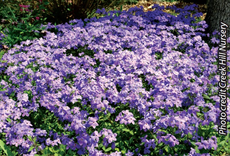 Creeping phlox with fragrant, star-shaped, purple flowers blooming late spring to early summer; drought tolerant; full-part shade; nativar; 6″-10″; whz 5-8; plug.