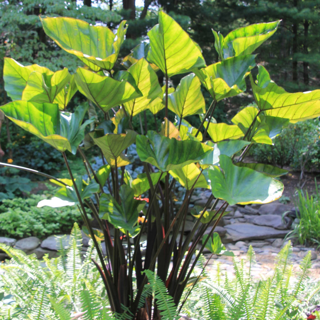 Native to tropical Asia and Polynesia and considered an evergreen perennial tuberous herb, Colocasia has given us lots of pleasure all summer long with its huge, velvet or glossy textured, dark green, heart-shaped leaves that are lined with darker veins, adding real drama to the shade garden near our pond. It’s also a sturdy backdrop for perennials in the flower border, although we suspect in most full sun situations, it will perform better if a soaker hose provides a little constant moisture. Excellent for water gardens when planted in a pot submerged in the pond; plant 18” on center; whz 8-11 (zone 7 in damp soil with mulch). (Hint: The height seems to have everything to do with the richness of the soil and the available moisture); we have indicated by each item whether they will arrive in bulb form or from tissue culture in ~4” pots ready for your garden or for a larger pot on the heat mat, depending on where you live.
