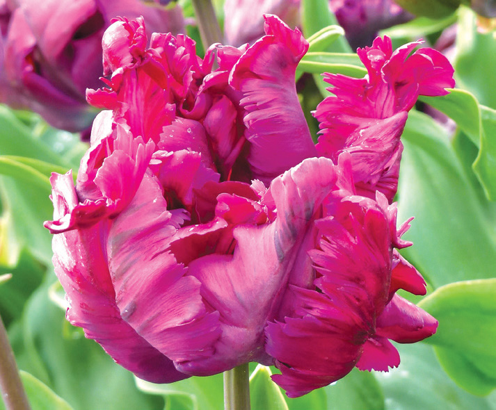 A popular triumph tulip now in parrot form; deep reddish-purple with green brush marks on thick wavy petals, opens slightly earlier than other parrot varieties; 18″-20″; mid-late spring.