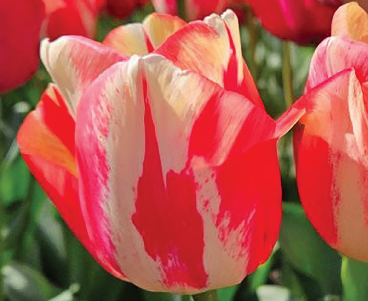A shift of colors as it matures and becomes even more variable; opens white with red flames then transitions to buttery cream with reddish-pink flames; 14″-18″; mid spring.