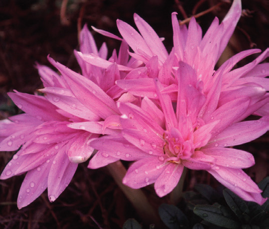 Often misnamed ‘Autumn Crocus’, cup-shaped flowers on naked stems; poisonous and tastes bad to critters that may be tempted to eat them; flowers appear in the fall and foliage, which resembles hosta leaves, appear in the spring; prefers rich, well drained soil and partial shade to full sun; many are species and are variable in their color and growth habit. Bloom mid-late fall; can bloom without being planted in soil; 3 per sq. ft; whz 4–8; 13/+ cm unless otherwise noted. Colchicum are long term perennial bulbs that get better each year.