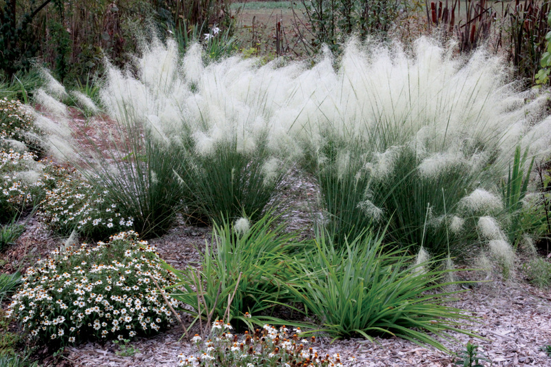 Beautiful, moonlight white, billowing seed heads; it has a more upright shape, grows a bit taller and blooms shortly after Pink Muhly Grass; a wonderful complement to the fall garden; native; drought tolerant; 4′-5′; whz 7-10; plug.