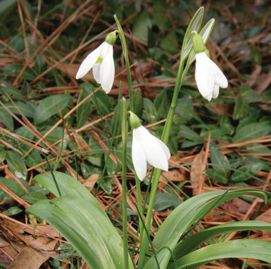 Lovely, nodding, fragrant flowers; 3-lobed, bell–shaped, clear white outer segments, inner segments resemble a corona, often green-tipped; bloom here in the late fall, throughout the winter and into spring; narrow, upright, linear, glaucous foliage; good for rock gardens and woodlands; performs best in shade in rich soil; critter proof; naturalizes in good conditons;10 per sq. ft.; 6/+ cm unless otherwise noted; whz 3–8.